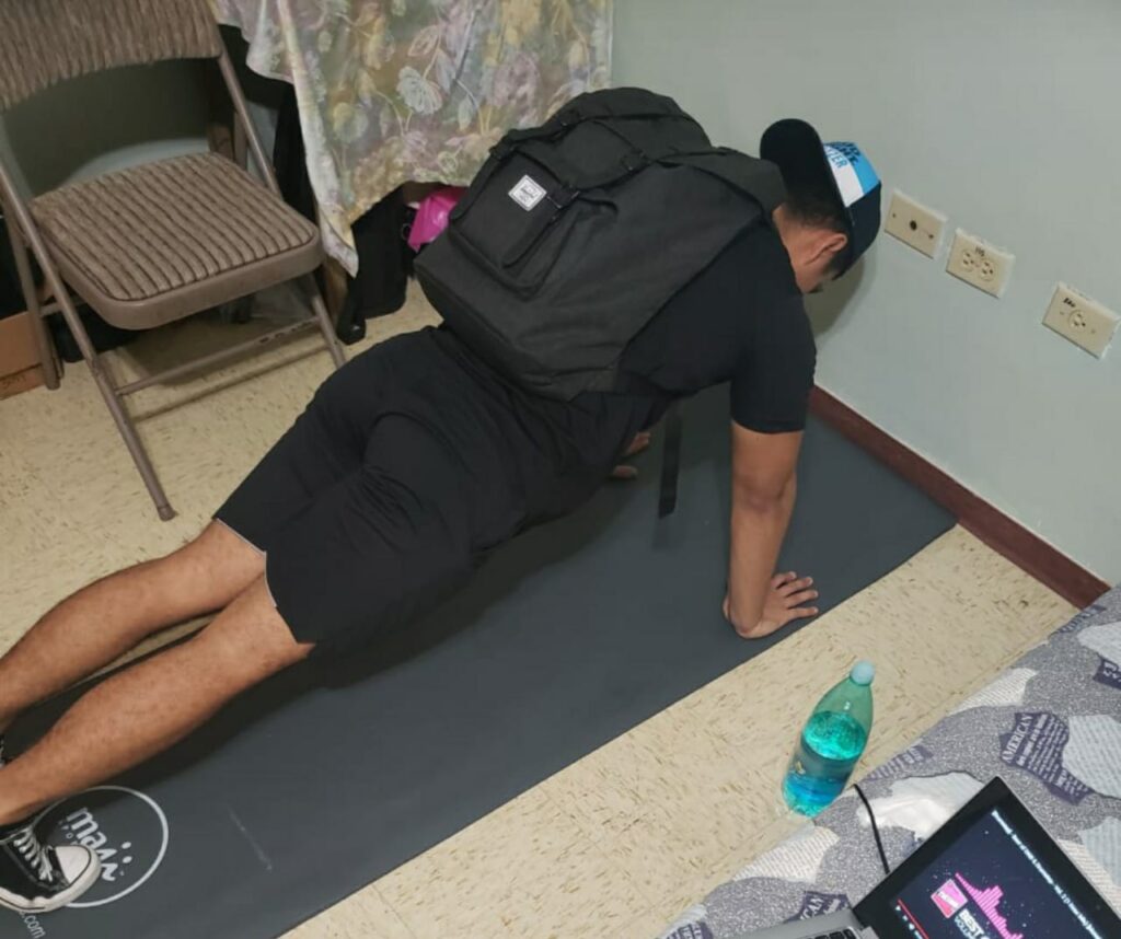 Enrico Valdez performs push-ups with a weighted backpack during one of his online sessions. Contributed photo