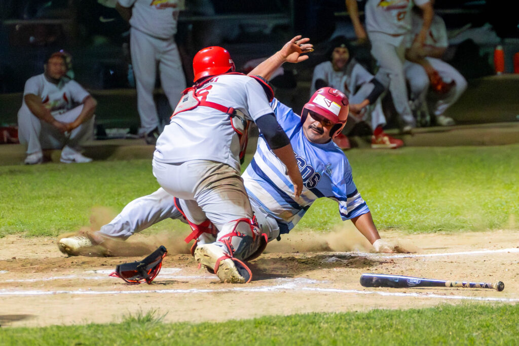 The Falcons’ Giovanni Mira slides home as Cardinals catcher Brian Camacho attempts to tag him out during the opening game of the 2024 Tan Holdings Saipan Baseball League at the Francisco “Tan Ko” Palacios Baseball Field on Monday.