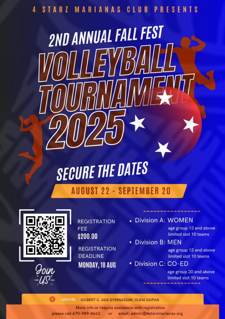 THE 4 Starz Marianas Club’s 2nd Annual Fall Fest Volleyball Tournament 2025 officially kicks off today, Monday, at the Gilbert C. Ada Gymnasium.
