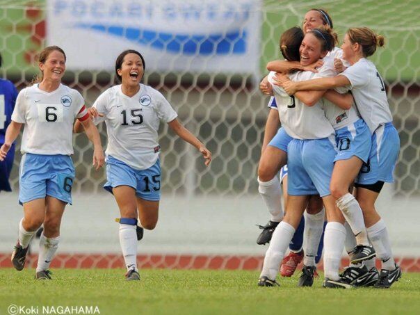 Members of the NMI Women’s National Team celebrate after a goal in an off-island tournament. Contributed file photo