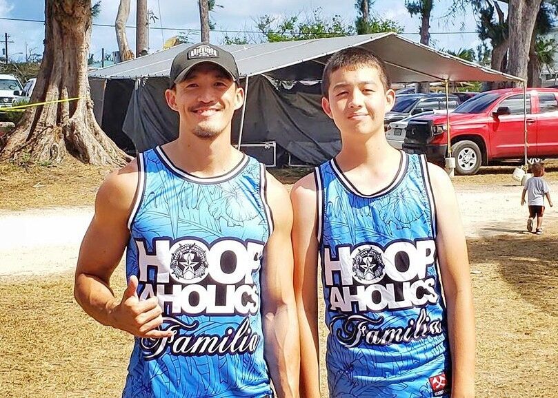 James Lee and his son, Dylan, pose for a photo at the Sabalu Market in Susupe.