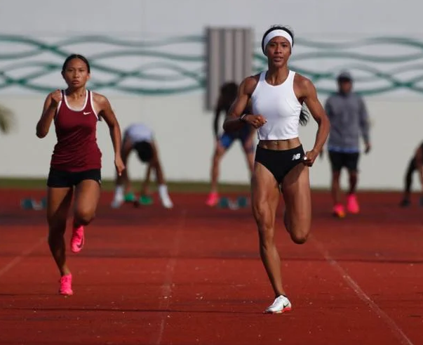 In this December 2023 photo, Regine Tugade, right, wins the women’s 100 meters at the GTFA National Championships. Tugade, on Friday, became Guam’s first-ever female Olympian to advance from a preliminary round.