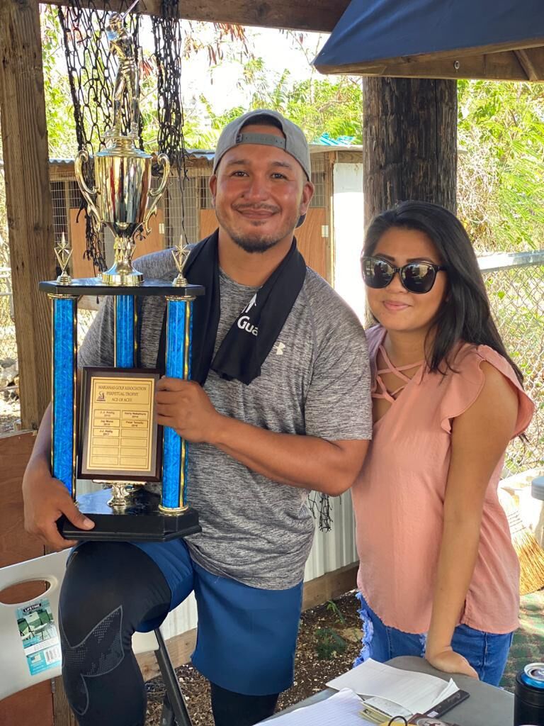 James Benavente, left, holds the Marianas Golf Association Ace of Aces trophy as he poses for a photo with Verna Deleon Guerrero. Contributed photo