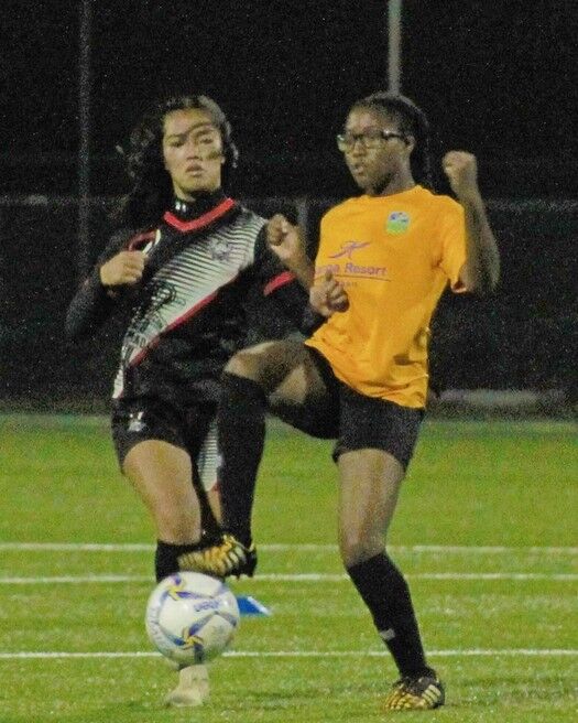 Kanoa’s Lynzey Green and Southern United’s Mariana Castro battle for the possession during a game of the Youth League Spring U17 Girls Division at the NMI Soccer Training Center. Photo by James F. Sablan Jr.