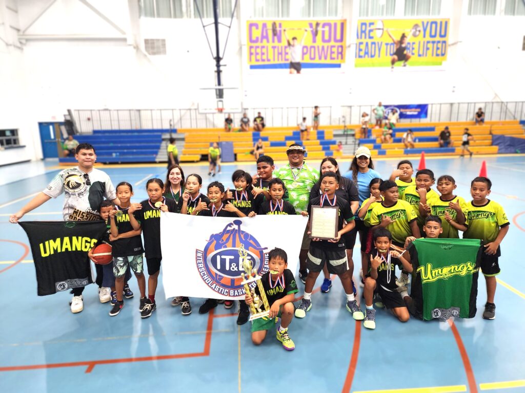 Koblerville Elementary School 1 players pose with the championship title in the elementary school division of the PSS-NMIBF Interscholastic Basketball League SY24-25 at the Marianas High School gym.