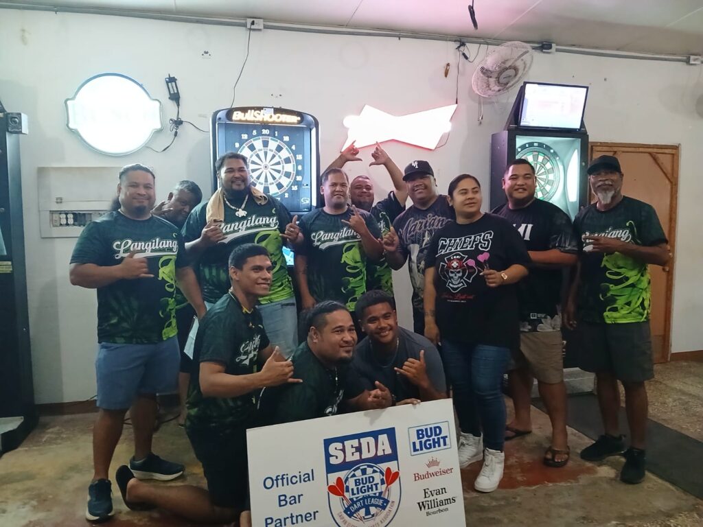 True North Langilang and Last Shot Taya Mana’i players pose for a group photo after their Thursday Flame Tree B Division game in the 2025 SEDA Bud Light Dart League at the True North Bar on Thursday last week.