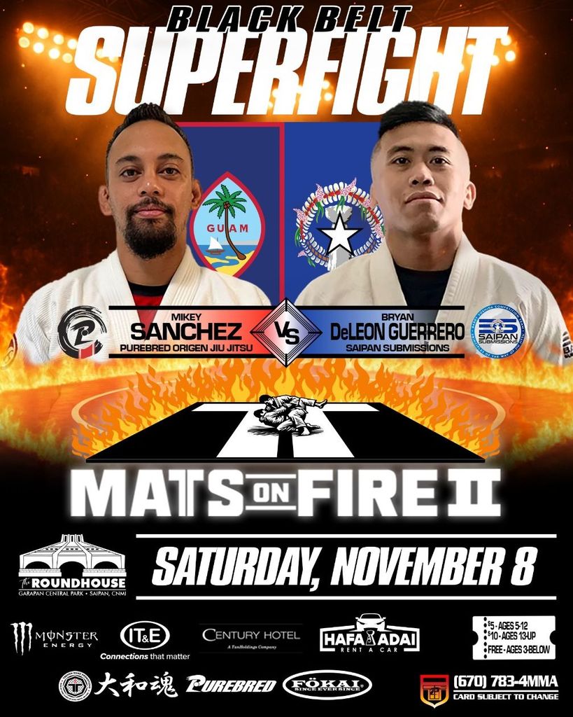 Micronesia’s most storied rivalry adds another chapter to the books as Guam’s Mikey Sanchez battles Saipan Submission’s head honcho, Bryan Deleon Guerrero, in a Black Belt Superfight that will highlight Mats on Fire II this Saturday, Nov. 8, at the Garapan Central Park roundhouse.