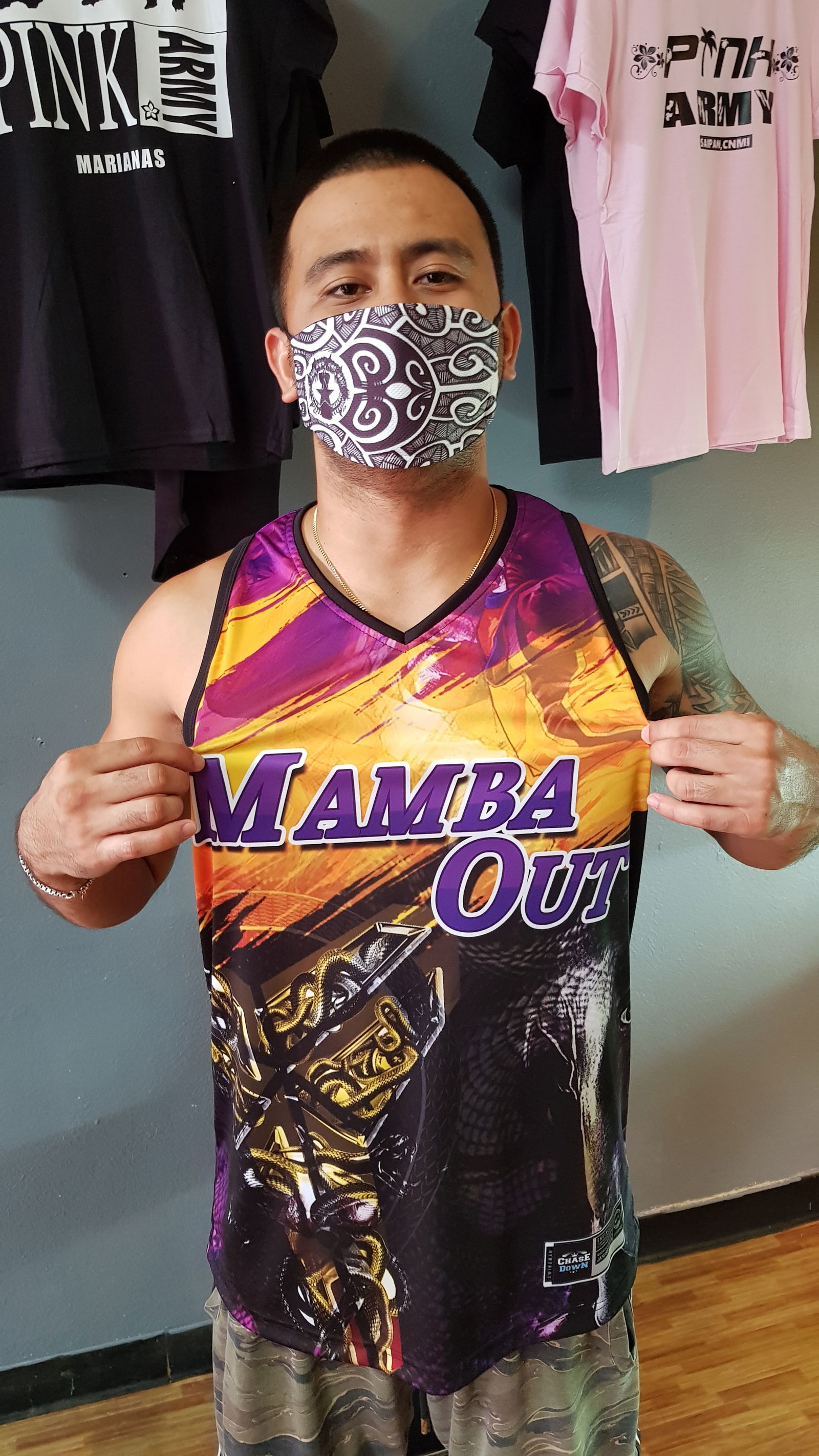 James Rabauliman poses with a jersey he made in tribute to the late Lakers great, Kobe Bryant.