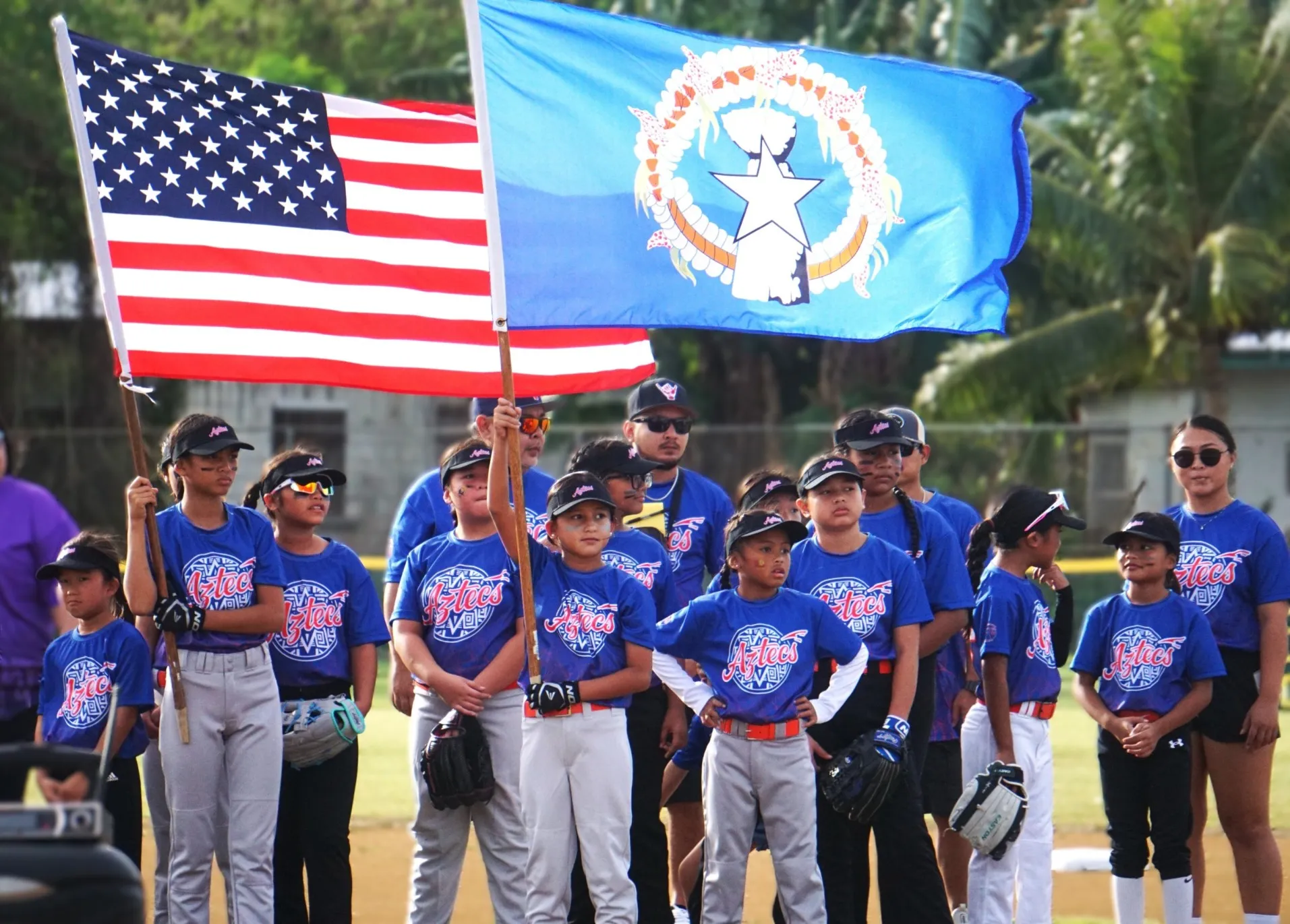 Saipan Little League Inc. marked another milestone for the island on Saturday as it officially kicked off the first-ever girls fastpitch softball league, dubbed “Girls With Game 2026,” at the Miguel “Tan Ge” Pangelinan ballfield. The inaugural league debuted five teams — Aztecs, Native Nenis, Pink Slugger, Little 8ers, and Diamond Divas. More details on the opening ceremony and games will be released in the next edition of Variety. Photo shows the Aztecs displaying the CNMI and U.S. flags during the opening ceremony of Saipan Little League Inc.’s Girls With Game 2026 at the Miguel “Tan Ge” Pangelinan ballfield on Saturday morning.