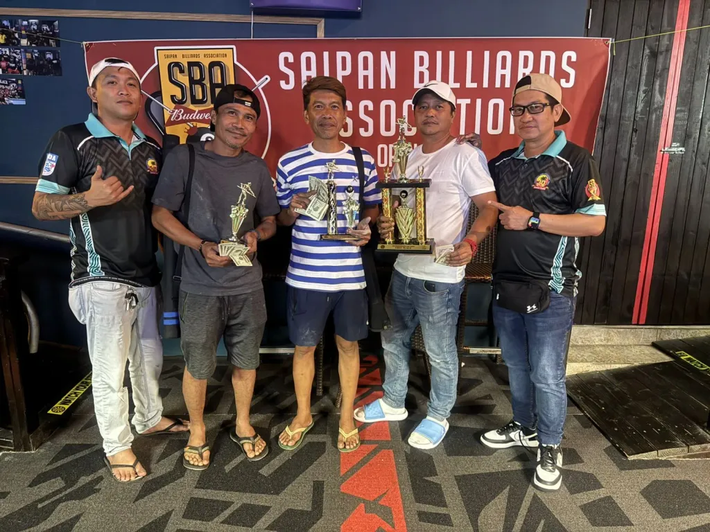 The top three winners of the 2025 SBA Budweiser Open 8-Ball League banquet tourney — Jonathan Soriano (1st), Mario Vizcaya (2nd), and Rey Torres (3rd) — pose with their trophies during the awards ceremony at Black 8 Pool Bar on Sunday, Jan. 11, 2026.