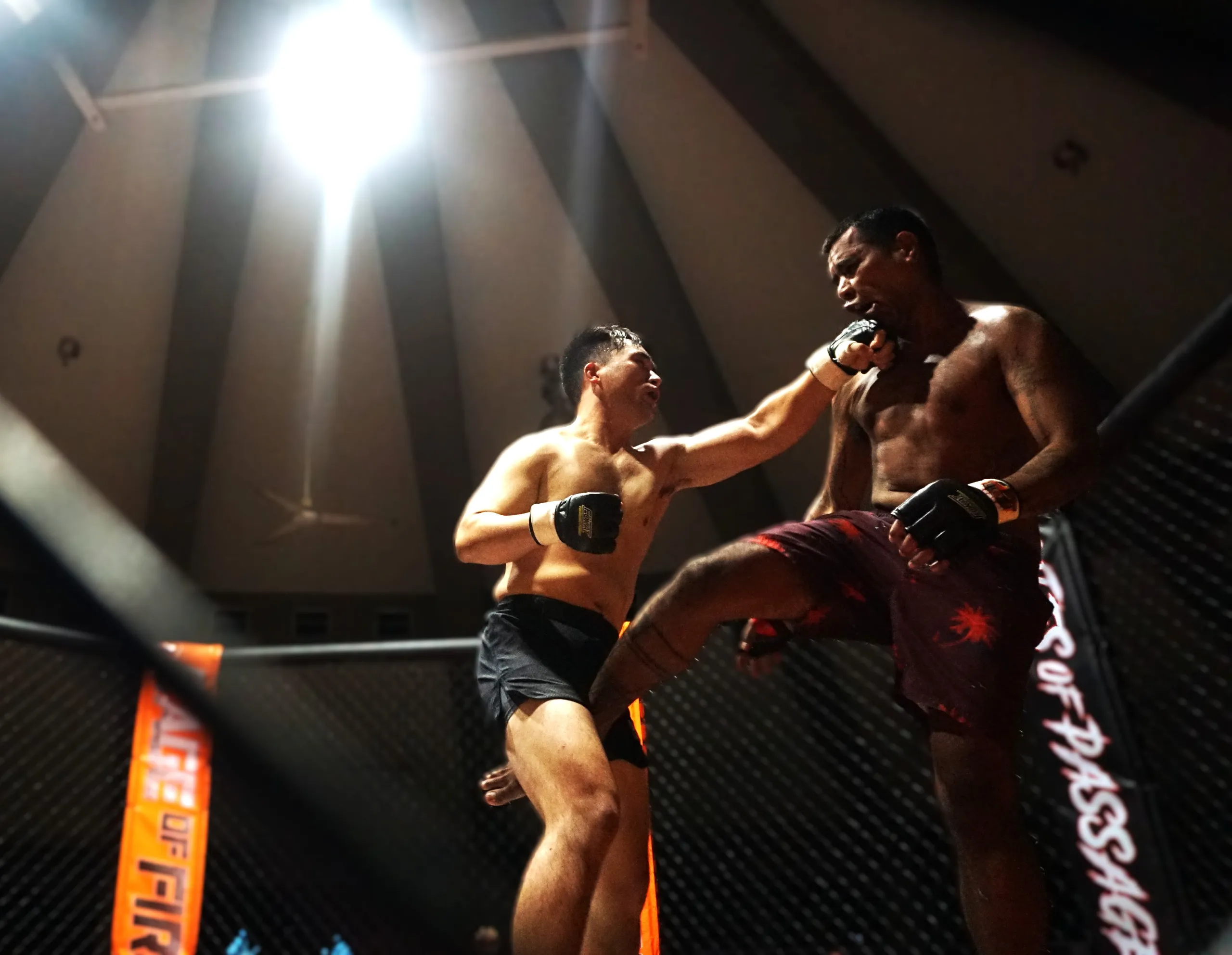 TRENCH Tech’s Cage of Fire II lived up to its explosive name on Saturday night at the Garapan Central Park Roundhouse, delivering quick and spectacular finishes in the semi- and main events. The new no-judge, one-fall-to-a-finish format compelled fighters to seek knockouts or submissions, resulting in a thrilling night of fast-paced action.