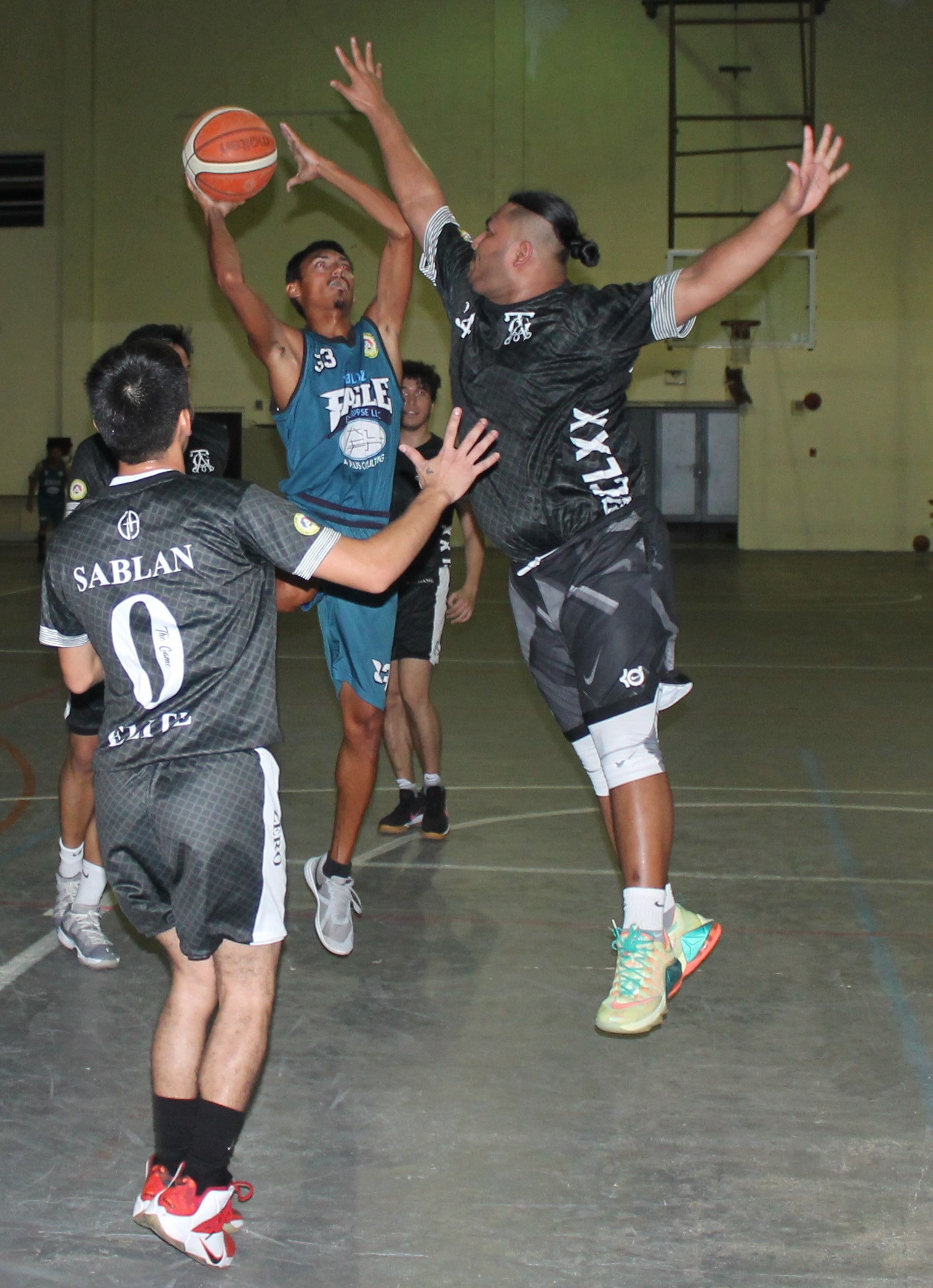 The Blue Eagles’ Douglas Schmidt takes the shot while surrounded by Eats Easy x The Game defenders  during a UFO-IT&E Basketball League game in 2019 at the Ada gym. Photo by James F. Sablan Jr.