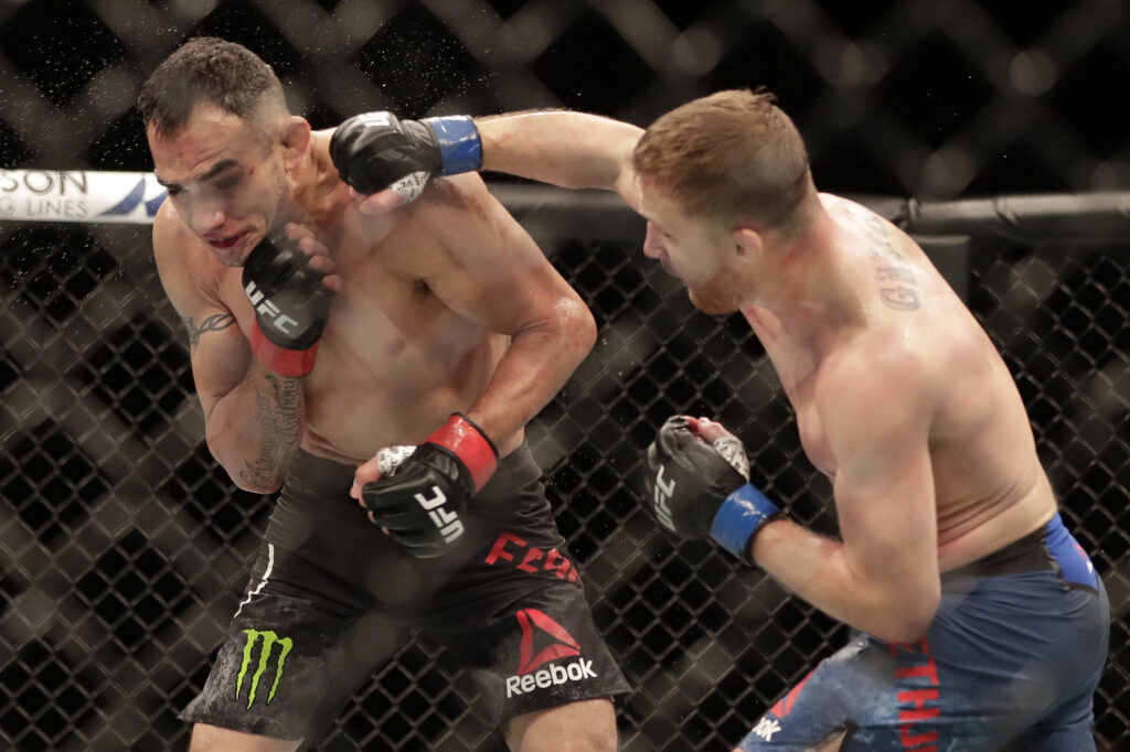 Justin Gaethje, right, punches Tony Ferguson during a UFC 249 mixed martial arts bout, Saturday, in Jacksonville, Fla. AP