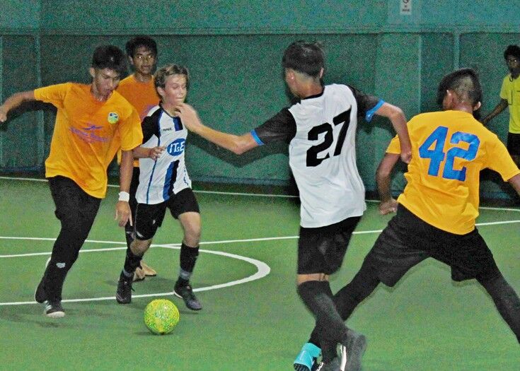 Kanoa and MP United battle for the possession during the semifinal game of the 2019-2020 Holiday Futsal Jam U15 Boys Division on Saturday at the TSL Sports Complex. Photo by James F. Sablan Jr.