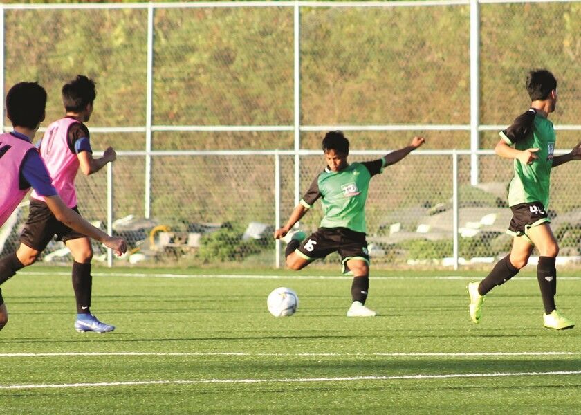 TanHoldings’ Oliver Fajardo winds up for the long pass in a Youth League game at the NMI Soccer Training Center. Photo by James F. Sablan Jr.
