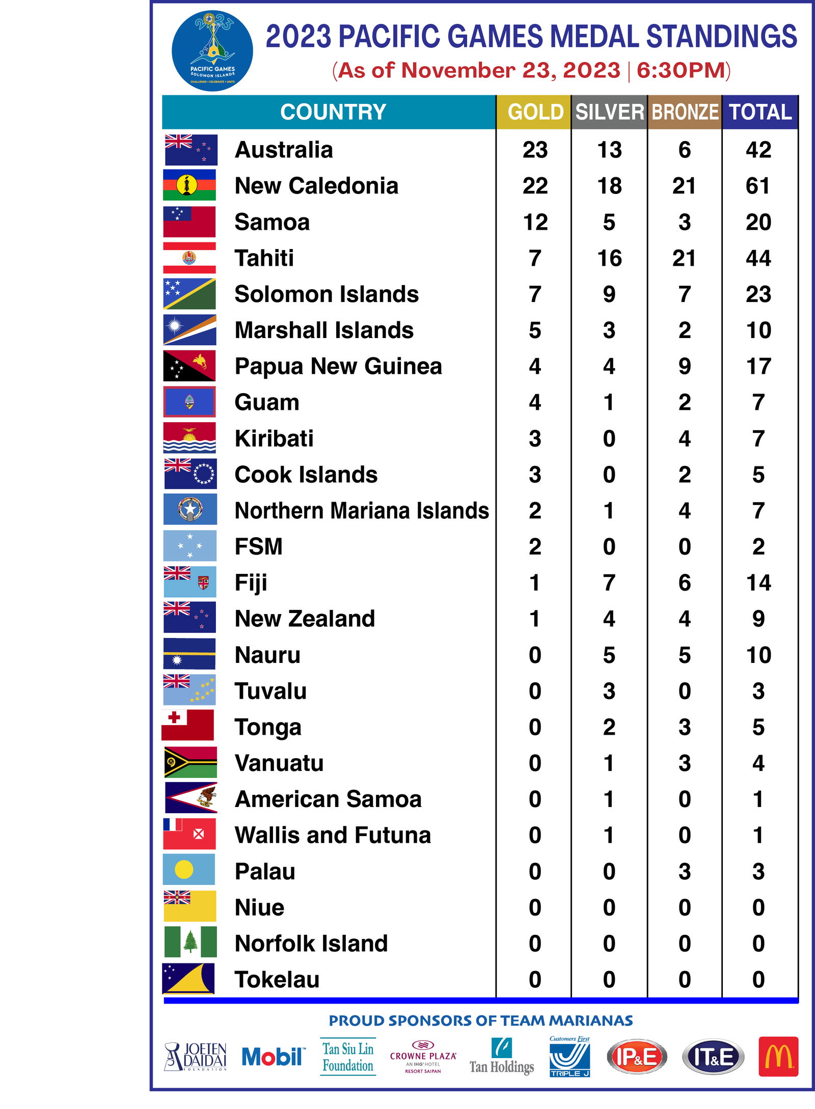 For the medal tally, pending the results of the finals events in swimming Thursday night, Team Marianas is ranked at No. 11 with its 2 gold medals, 1 silver, and 4 bronzes. Australia has overtaken New Caledonia for the lead with the Land Down Under representatives collecting 23 golds against the French territory’s 22.