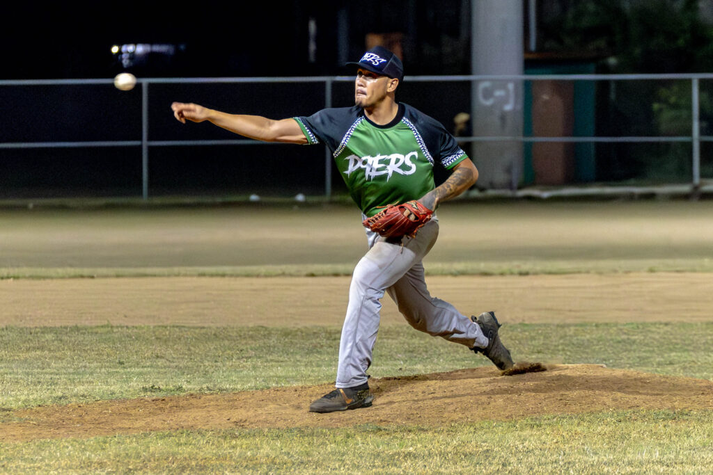 D9er’s Mel Sakisat pitches against the Padres in a 2024 Tan Holdings Saipan Baseball League game at the Francisco “Tan Ko” Palacios Baseball Field.