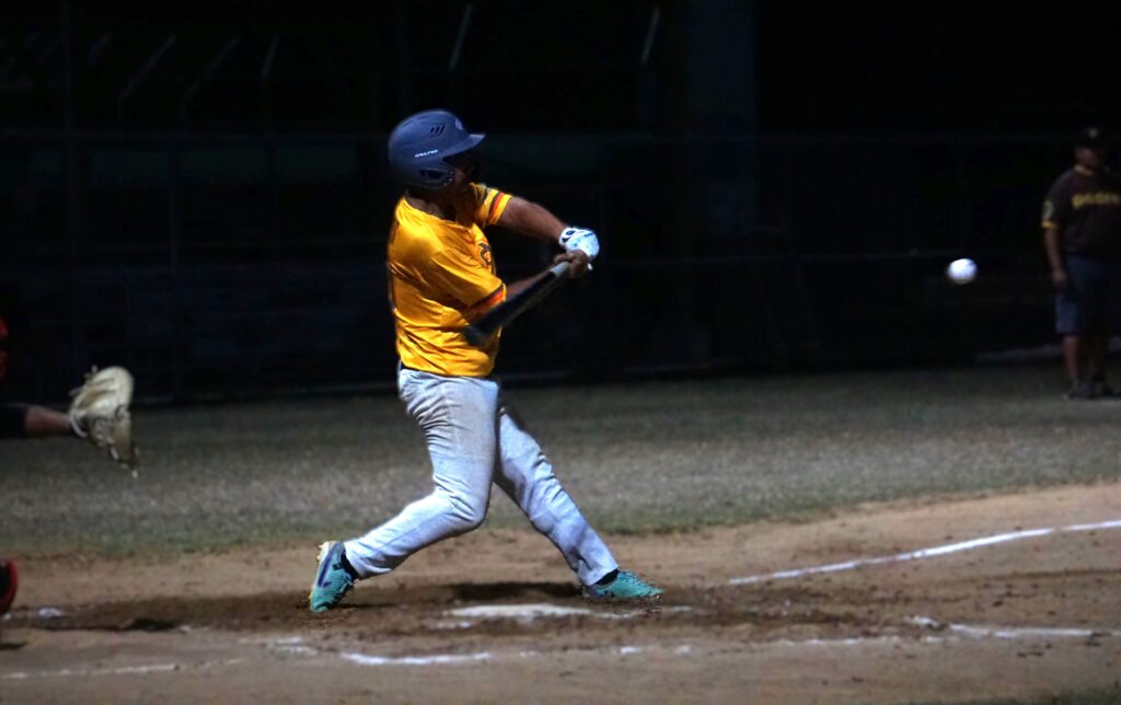 Padres’ Ben Flores swings during a 2025 Saipan Baseball League game at the Francisco “Tan Ko” Palacios Baseball Field.