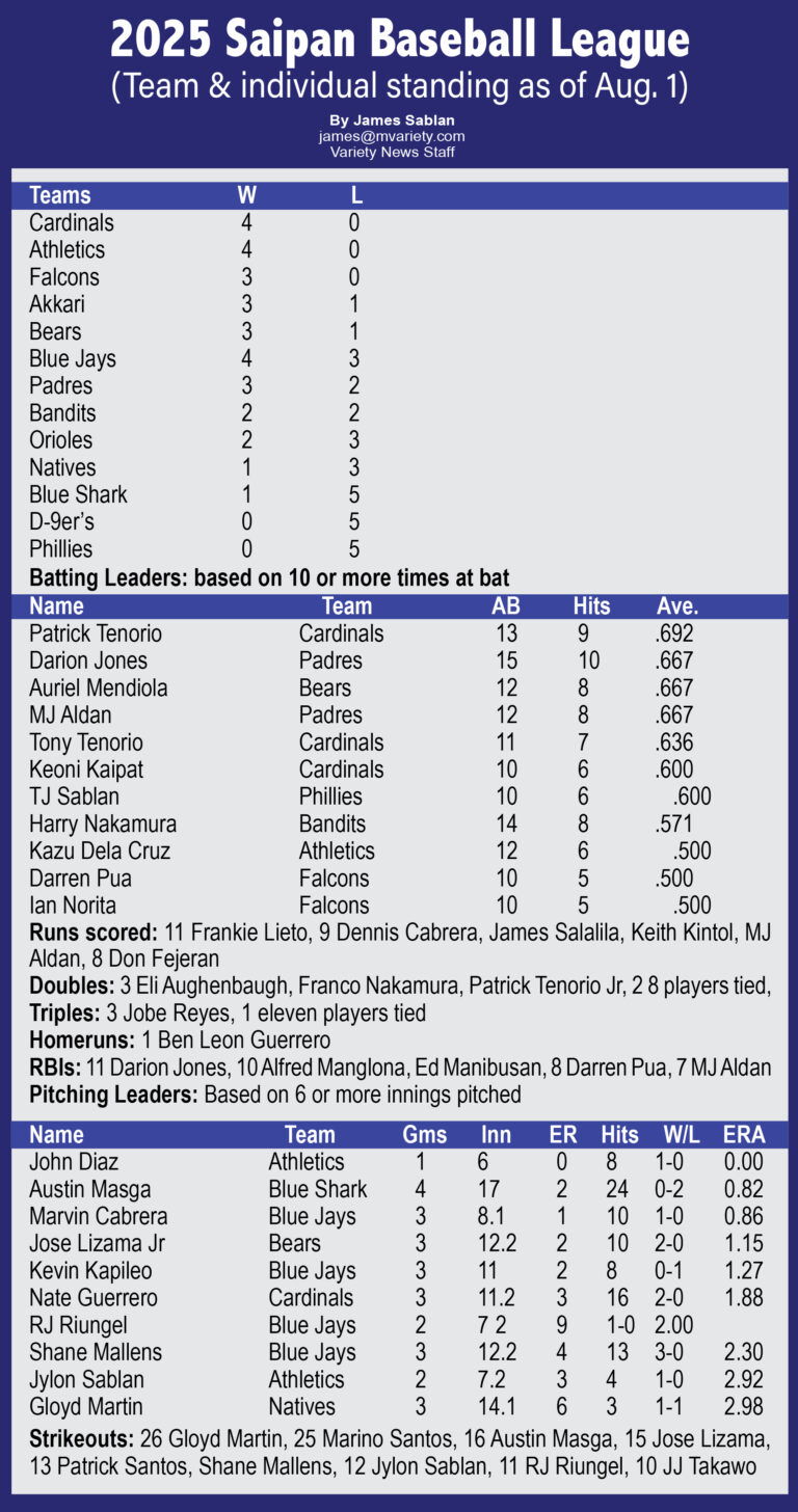 NMI’s John Paul Delos Reyes extends for the lob return during his debut match in the men’s singles event of the Crowne Plaza Northern Marianas Open 2025 at the Ada gym on Tuesday. Northern Marianas Badminton Association photo NMI’s Daniell Pablo steps forward for the backhand retu…