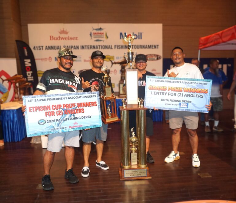 VIP Sponsor First Hawaiian Bank makes a $500 donation on July 15, 2025, at their branch in Chalan Laulau, Saipan, for the 23rd Annual HANMI Charity Classic Golf Tournament. The tournament is scheduled for July 26 at LaoLao Bay Golf & Resort. From left, golf committee member Archie Ajoste; FH…