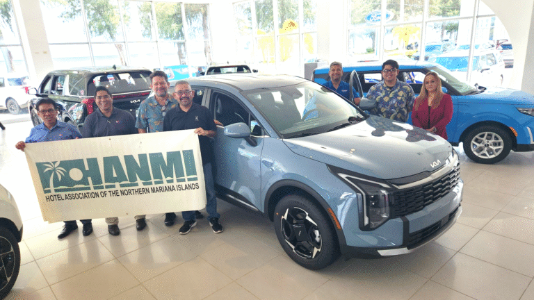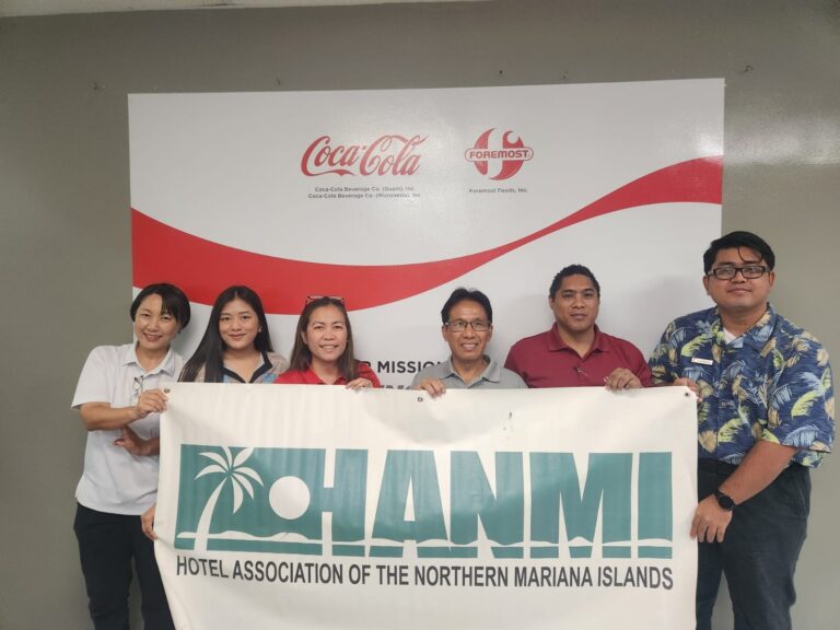 Coca-Cola sales manager Ailene Benavidez, third left, donates drink products on July 2, 2025, at the company office in Chalan Laulau, Saipan, for the course and banquet of the 23rd Annual HANMI Charity Classic Golf Tournament scheduled for July 26 at LaoLao Bay Golf & Resort. From left, tourna…