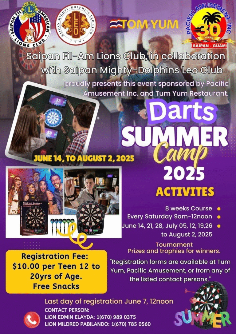JOIN us for fun and exciting activities this summer! The Dart Summer Camp runs from June 14 to Aug. 2, 2025, and is for kids 12 years old and above. Every Saturday, there will be games, prizes, and a dart tournament! The camp is organized by Saipan Fil-Am Lions Club and Saipan Mighty-Dolphins Leo C…
