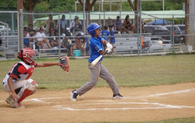 Blue Jays Jr.’s Kody Maratita attempts a swing during a game against the Bears Jr. in the Junior Division of the 2025 Saipan Little League Baseball at the Francisco “Tan Ko” Palacios Baseball Field on Saturday. Photo by James F. Sablan Jr. Bears Jr.’s Charles Molina pitches against the …