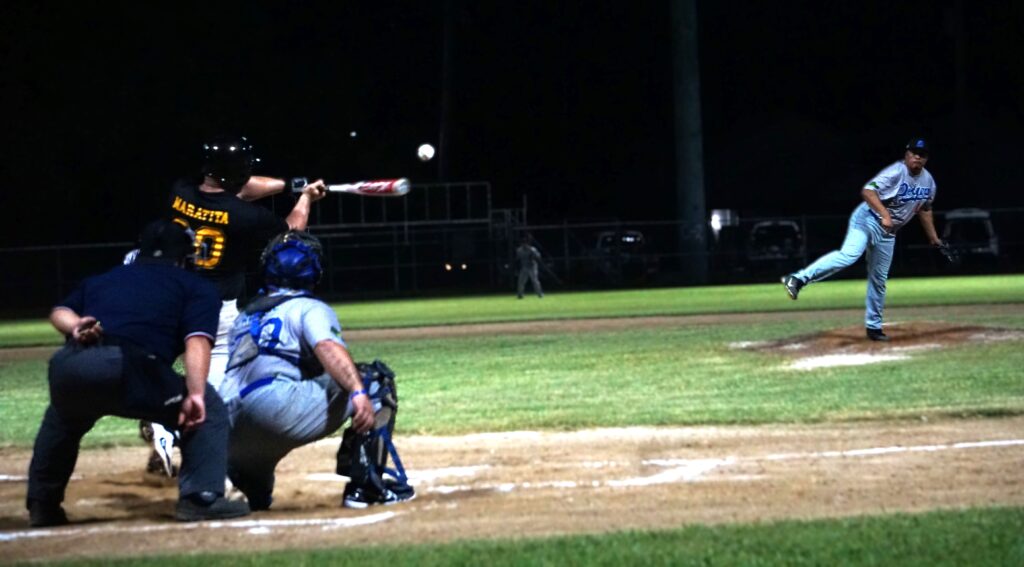 The Pirates’ Audie Maratita swings for a hit during a game against the Dodgers in the 2024 SBL Masters League at the Francisco “Tan Ko” Palacios Baseball Field.