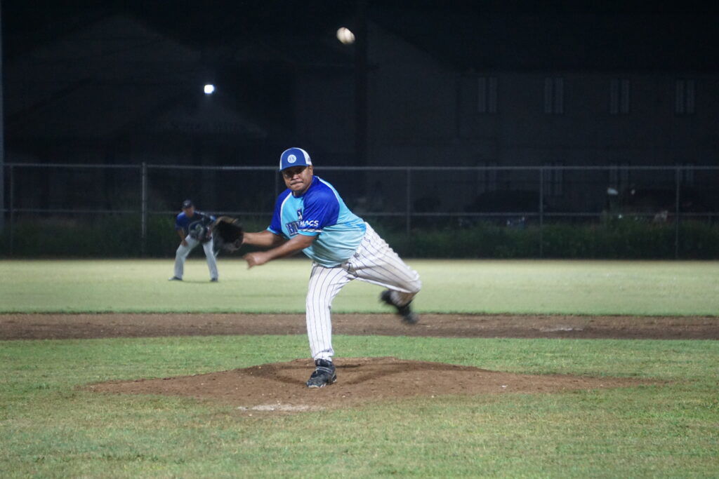The Blue Jays’ Kevin Kapileo pitches against the Spartans on Thursday, before the rain forced the postponement of the 2023 SBL Masters League game at the Francisco “Tan Ko” Palacios Baseball Field.