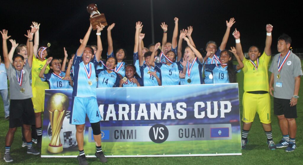 Members of the NMI U19 soccer women’s team celebrate after winning the 2018 Marianas Cup at the NMI Soccer Training Center in Koblerville. Photo by James F. Sablan Jr.