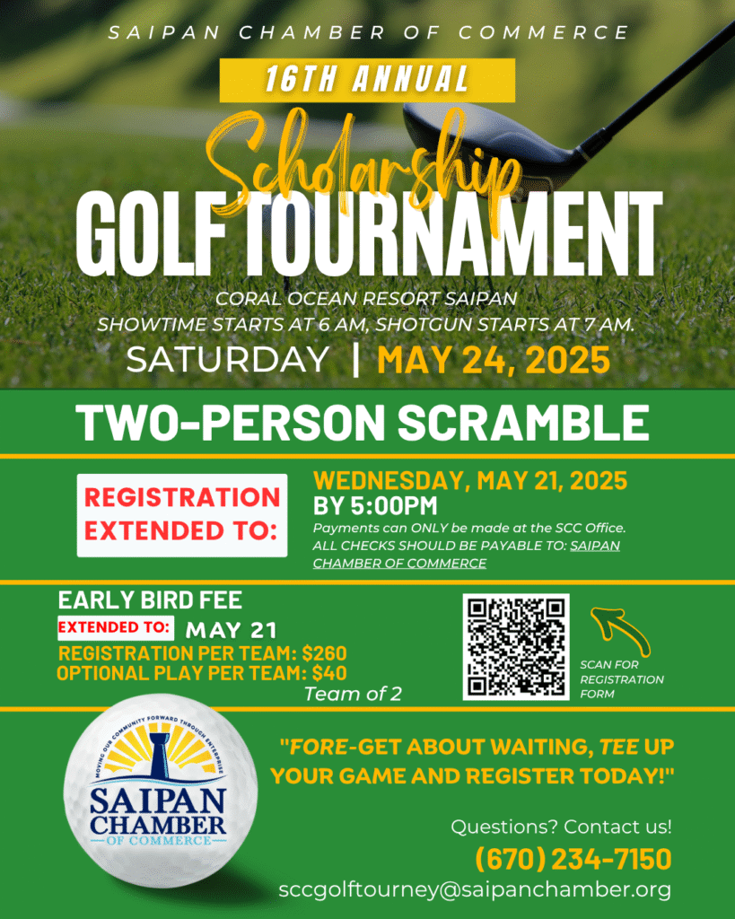 THE Saipan Chamber of Commerce is pleased to announce the extension of the registration deadline for its 16th Annual Scholarship Golf Tournament. Participants now have until 5 p.m. on Wednesday, May 21, 2025, to register.
