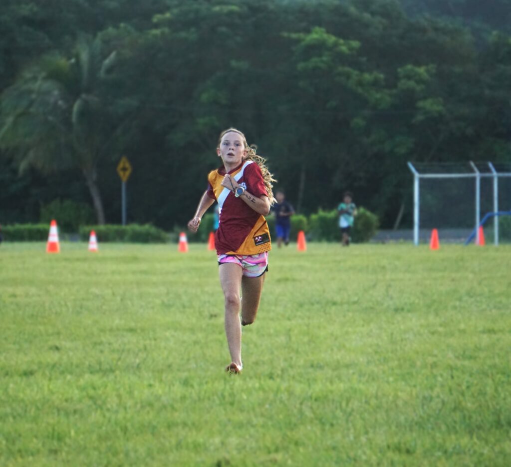 Saipan Community School’s LoVel Spaeth pushes through the final leg of the middle school race in the NMA-PSS All-School Cross Country SY25-26 at Airport Field on Saturday morning.