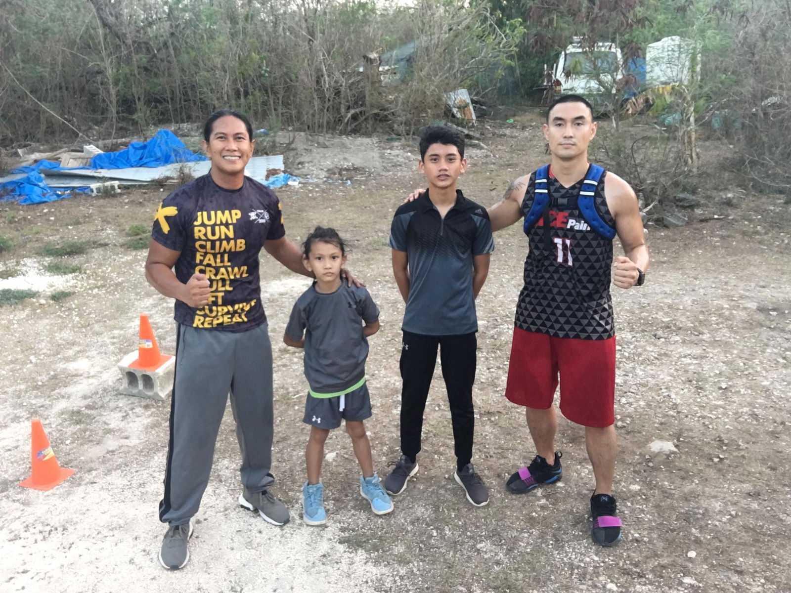From left, Dexter Tenorio, his sons Derek and Mickyiel Josh with Alex Lauron pose for a photo after a workout session at home. Photo provided by Alex Lauron