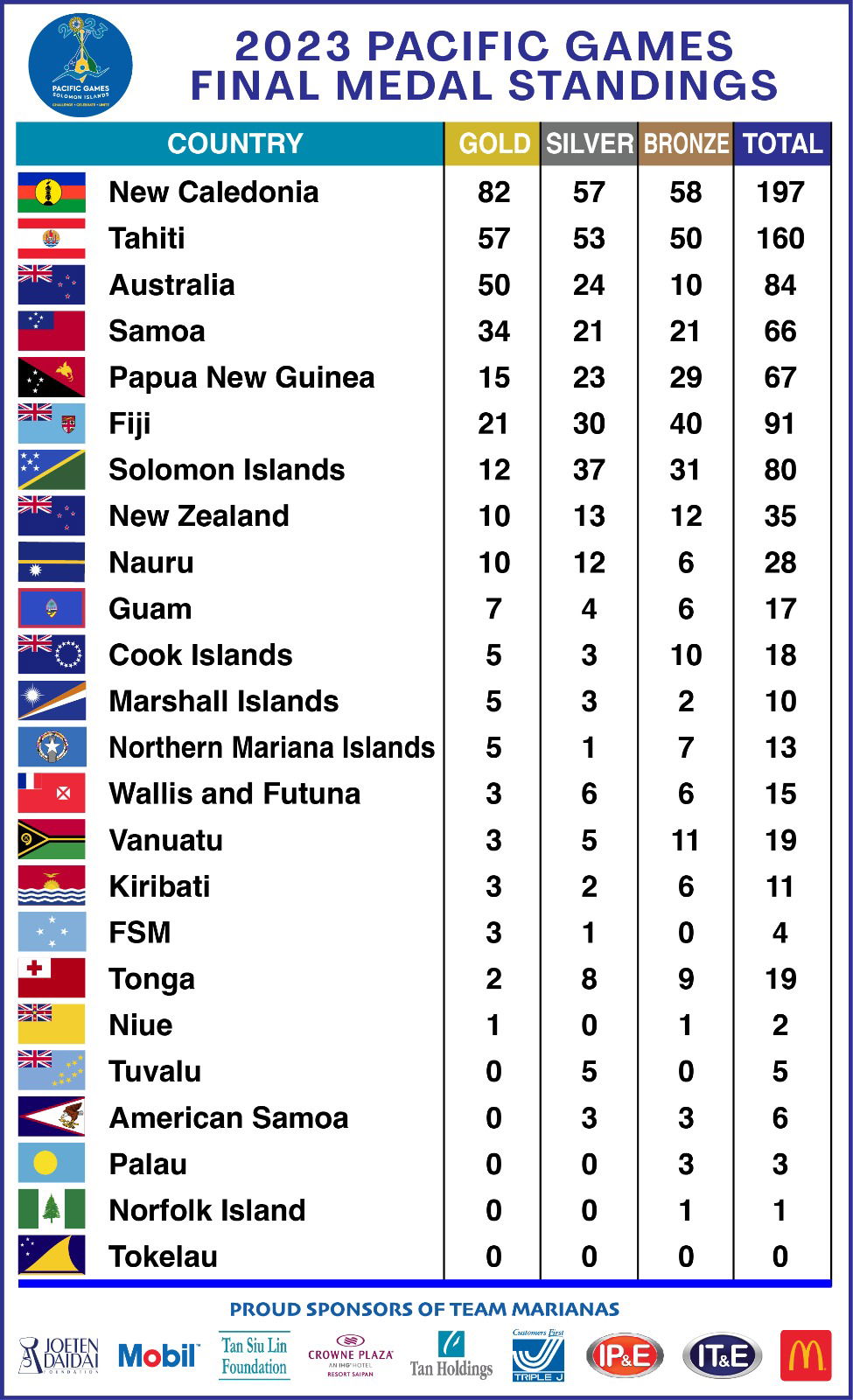 HONIARA, Solomon Islands (Northern Marianas Sports Association) — Beach Volleyball’s Logan Mister and Andrew Johnson made it to the podium, while athletics’ Tania Tan may have set another record, giving Team Marianas a strong finish in the 2023 Pacific Games that concluded  Saturday night in Honiara, the Solomon Islands.