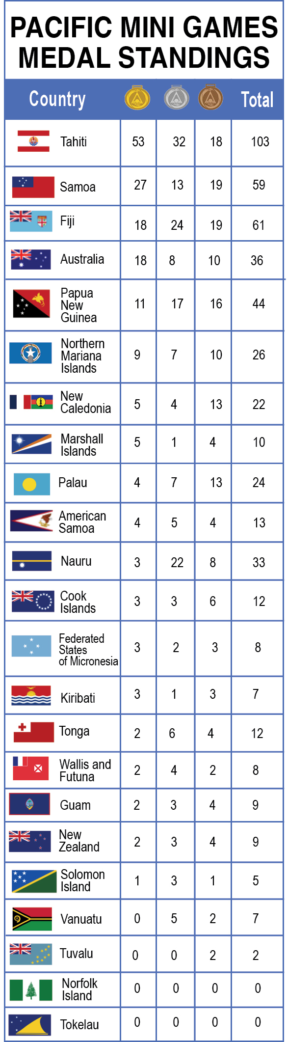 With 26 total medals, Team Marianas remains in the Top 10 of the overall medal standings and ranks first among Micronesian nations, surpassing: