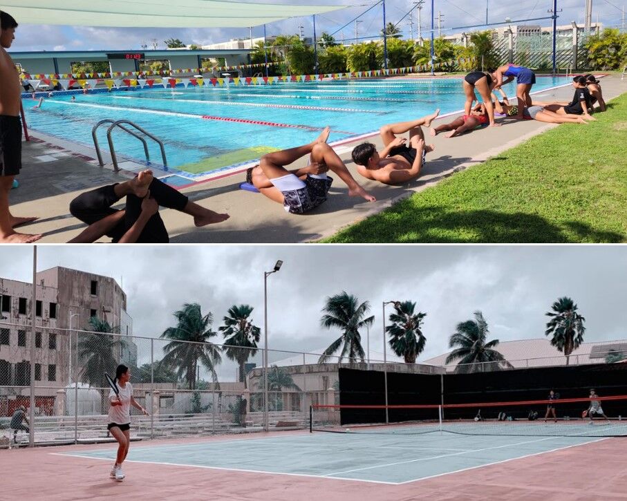 Top photo shows CNMI swimmers training at the St. John’s Academy pool in Guam on Thursday afternoon. They will head to the Marshall Islands on Friday morning. Bottom photo shows CNMI players participating in practice sessions in one of the two tennis facilities in Majuro in preparation for the 2024 Micronesian Games.