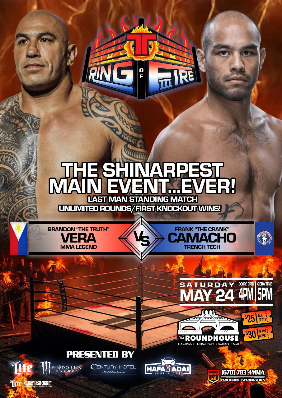 (Trench Tech) — In what will be the “shinarpest” main event in Marianas combat sports history, two of Asia-Pacific’s elite warriors will trade punches at the top of the card of Trench Tech’s Ring of Fire III on Memorial Day weekend at the Garapan Central Park Roundhouse. The event promises to be an action-filled night with boxing and kickboxing matches being the belle of the ball. Headlining the event will be a dream match for many of the CNMI’s MMA fans as homegrown hero Frank “The Crank” Camacho steps up to face the legendary Brandon “The Truth” Vera, coming out of retirement for one night only in a limitless boxing match.