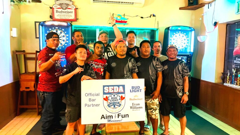 Bistro Waschobw and Bistro High Caliber 2.0 players pose for a group photo after their match in the Thursday Fanihi Division of the 2025 SEDA Bud Light Dart League at the Bistro in Garapan on Thursday night.