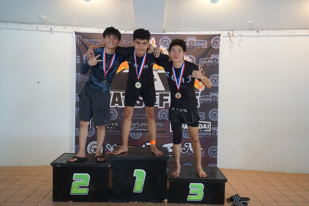 The bantamweight medalists: 1st place Edward Diaz; 2nd place Colby Reyes; 3rd place Seth Sablan.