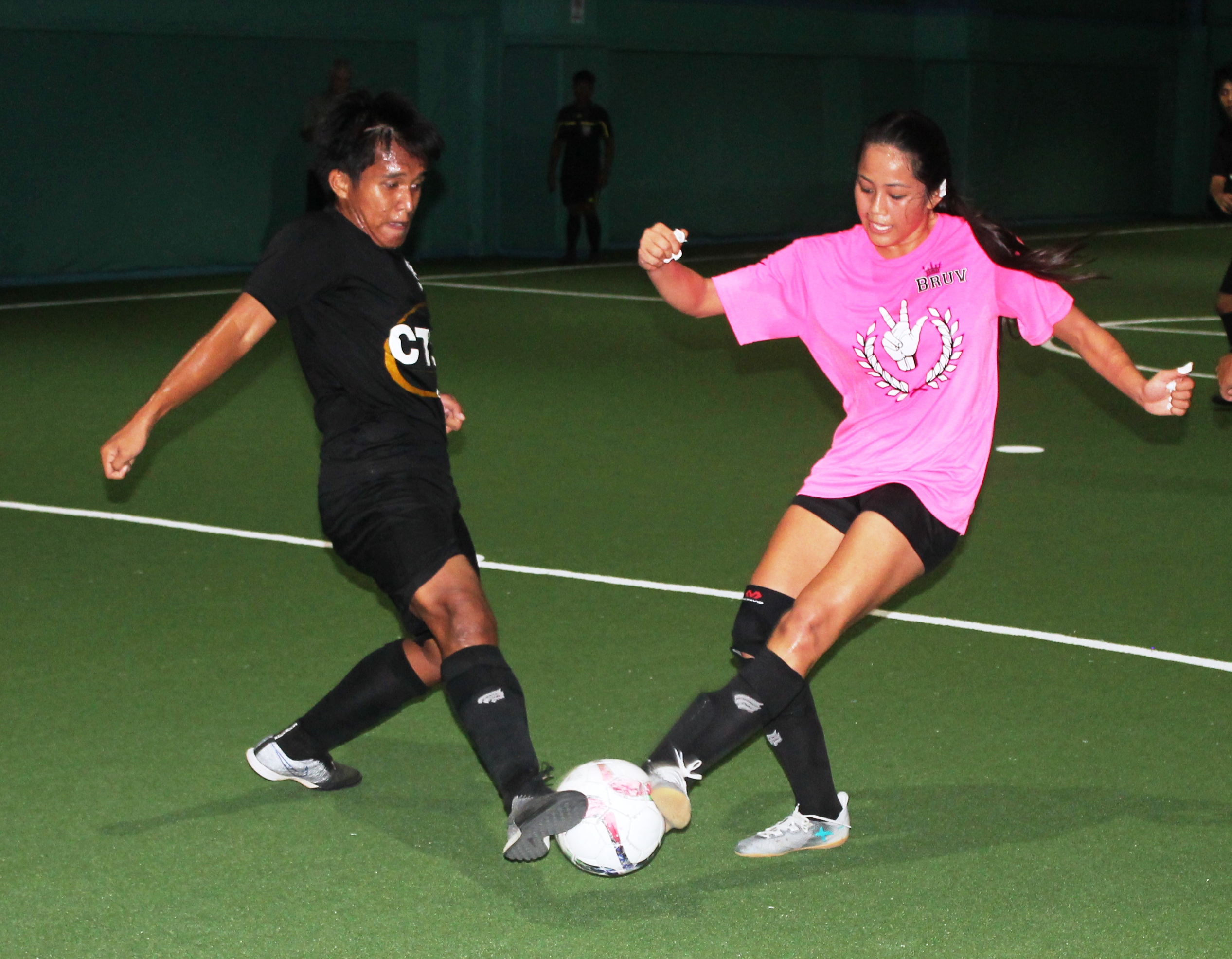Thaiphi Austria, left, makes contact with the ball as Guine Borja goes for the shot during the finals of the 2018 Youth Futsal Tournament at TSL Sports Complex. Photo by James F. Sablan Jr.