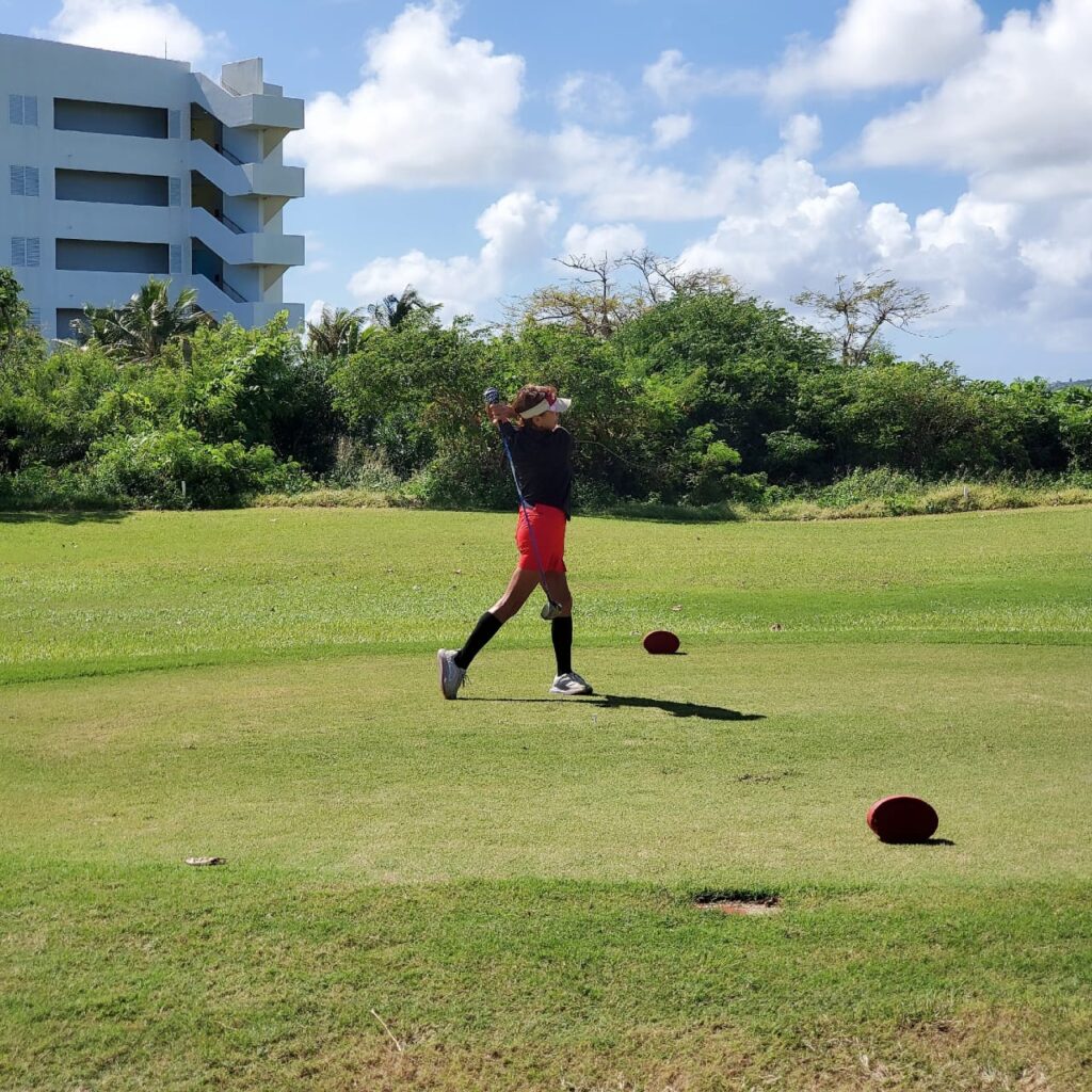 Yuko Togawa takes a swing during the December Ace of the Month tournament of the CNMI Women’s Golf Association at LaoLao Bay Golf & Resort on Saturday. Photo by James F. Sablan Jr.