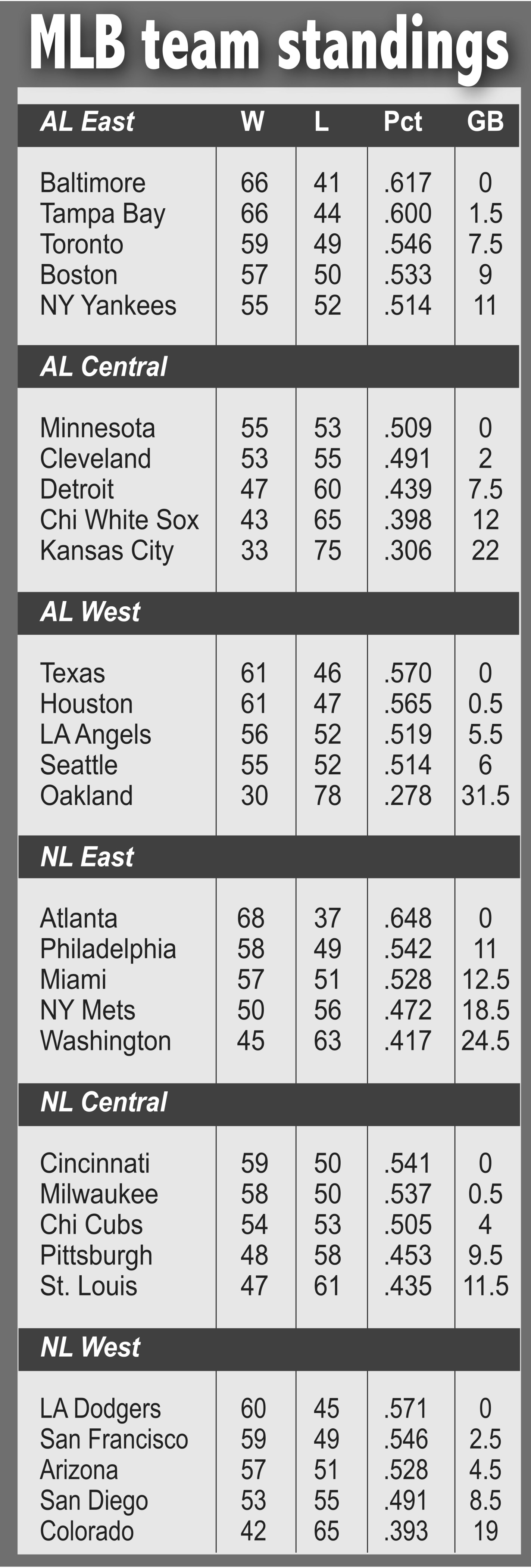 Angels starter Patrick Sandoval (6-8) pitched five innings and allowed two runs on three hits, with four walks and three strikeouts. Atlanta scored a run in the first inning. Ozzie Albies singled and came around to score on Matt Olson’s sacrifice fly, his league-leading 90th RBI of the season.
