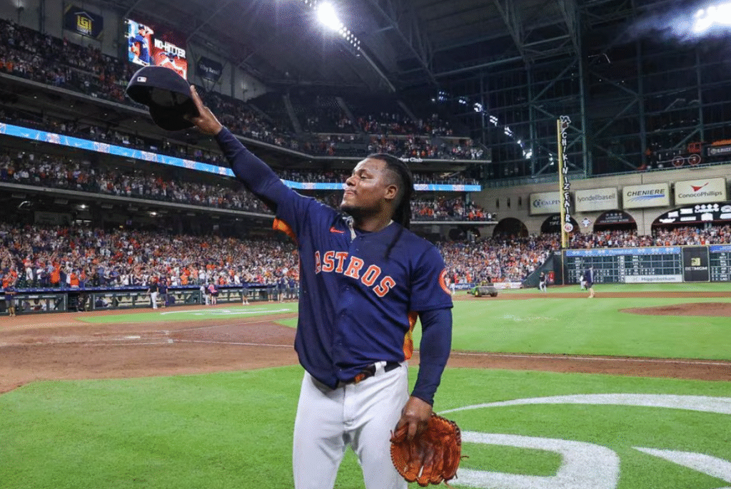 Houston Astros starting pitcher Framber Valdez (59) waves to the crowd after pitching a no-hitter against the Cleveland Guardians at Minute Maid Park in Houston, Texas, Reuters, Aug. 2, 2023.