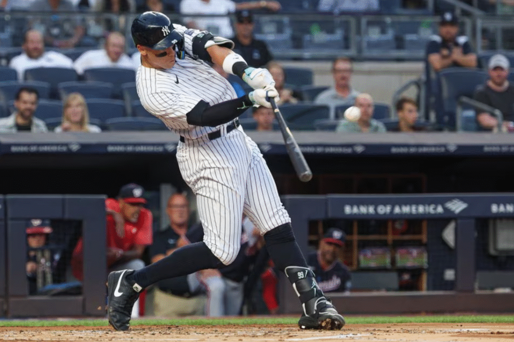 New York Yankees right fielder Aaron Judge (99) hits a solo home run during the first inning against the Washington Nationals at Yankee Stadium, the Bronx, New York, Aug. 23, 2023.