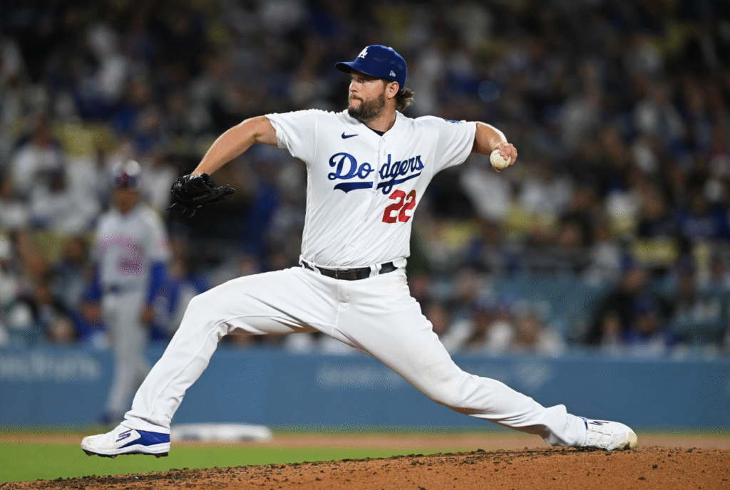 Los Angeles Dodgers starting pitcher Clayton Kershaw (22) on the mound in the seventh inning against the New York Mets at Dodger Stadium in Los Angeles, California, April 18, 2023.