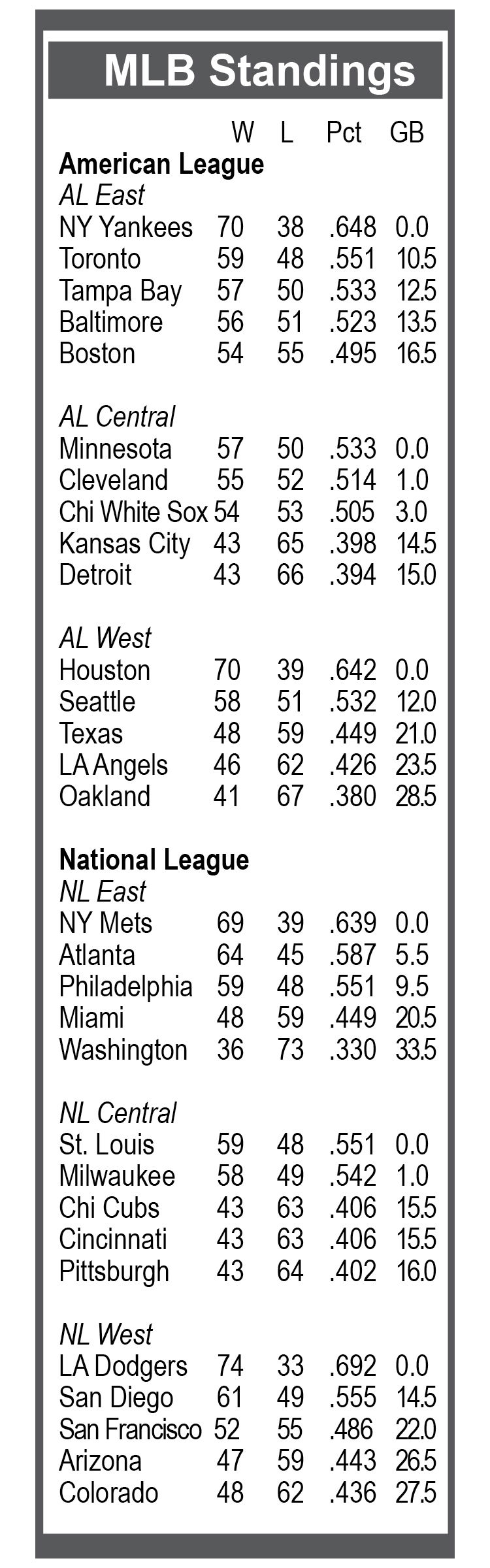 Houston’s Jose Altuve had an RBI double in the fourth inning among his three hits and the team’s 14. The Astros have outscored the opposition 21-4 during their three-game win streak. Houston bench coach Joe Espada guided the club in place of manager Dusty Baker, who tested positive for Covid-19.