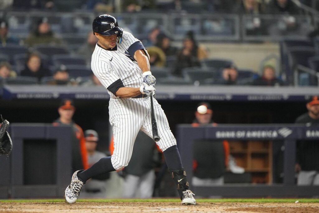 New York Yankees right fielder Giancarlo Stanton (27) hits a sacrifice fly ball during the sixth inning against the Baltimore Orioles at Yankee Stadium in the Bronx, New York on April 27, 2022.