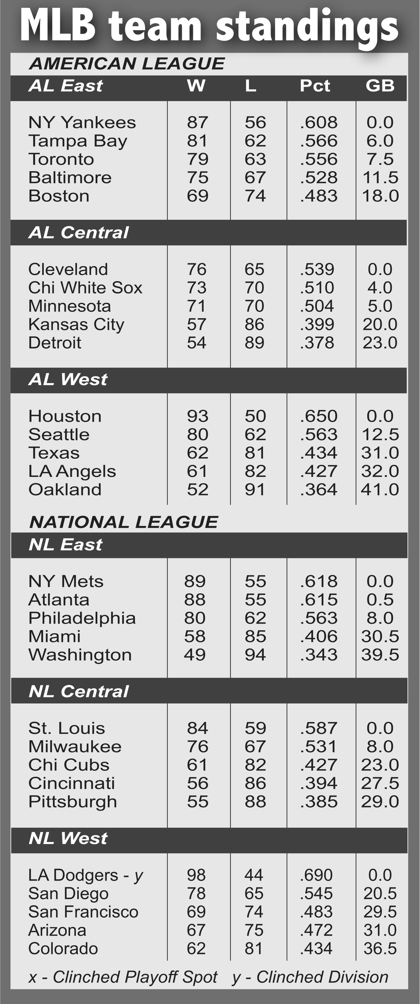 Angels star Mike Trout did not homer for the first time in eight games, as Matt Thaiss homered for the club’s only run. Trout had homered in seven straight, one short of the major league record shared by Dale Long (Pirates, 1956), Don Mattingly (Yankees, 1987) and Ken Griffey Jr. (Mariners, 1993). Trout went 0- for-3 with a walk.