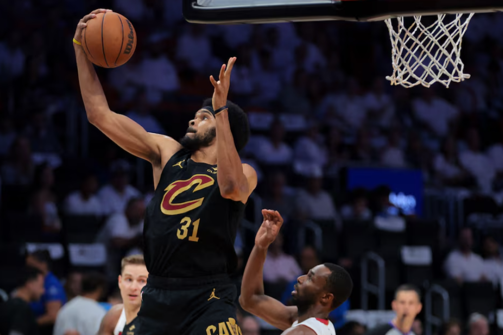 Cleveland Cavaliers center Jarrett Allen (31) collects a rebound against the Miami Heat in the first quarter during game four for the first round of the 2025 NBA Playoffs at Kaseya Center in Miami, Florida, April 28, 2025.