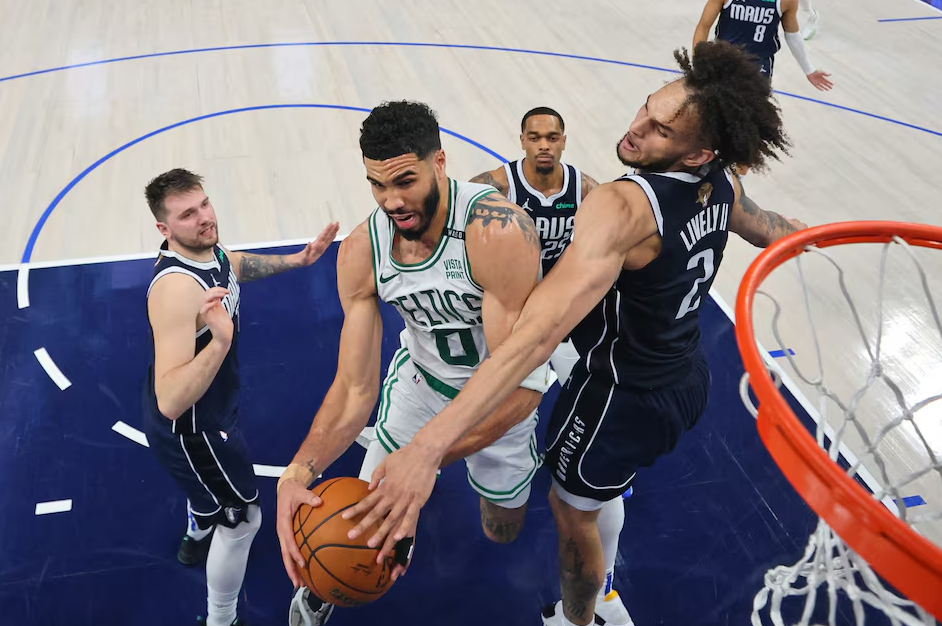 Boston Celtics forward Jayson Tatum (0) battles for the ball against Dallas Mavericks center Dereck Lively II (2) in the second quarter during game three of the 2024 NBA Finals at American Airlines Center in Dallas, Texas, June 12, 2024.